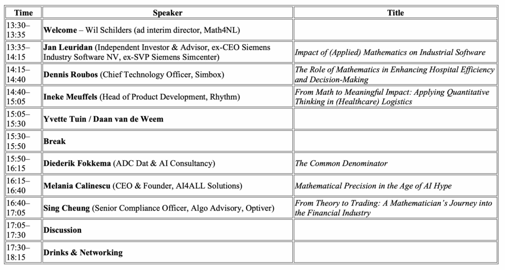 Each year, the Math4NL Community Event highlights how mathematics fuels innovation and societal progress. This edition celebrates mathematicians who moved from academia into leading roles in industry, consultancy, and technology — showing how their mathematical background continues to shape their careers and impact.